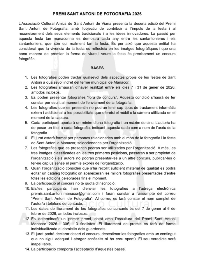 A poc més d’un mes per a la Revetlla de Sant Antoni, us presentam el cartell dels Premis Sant Antoni 2026 en les categories següents: